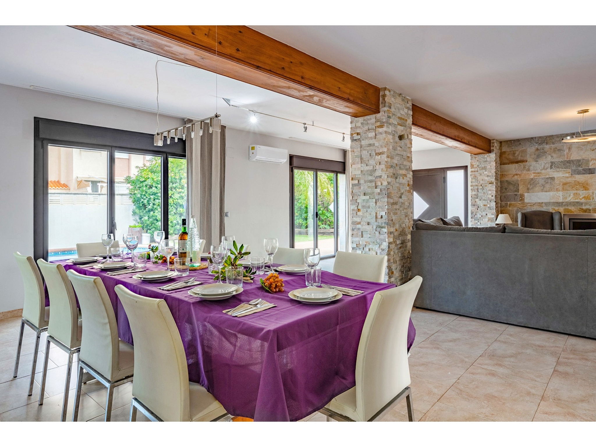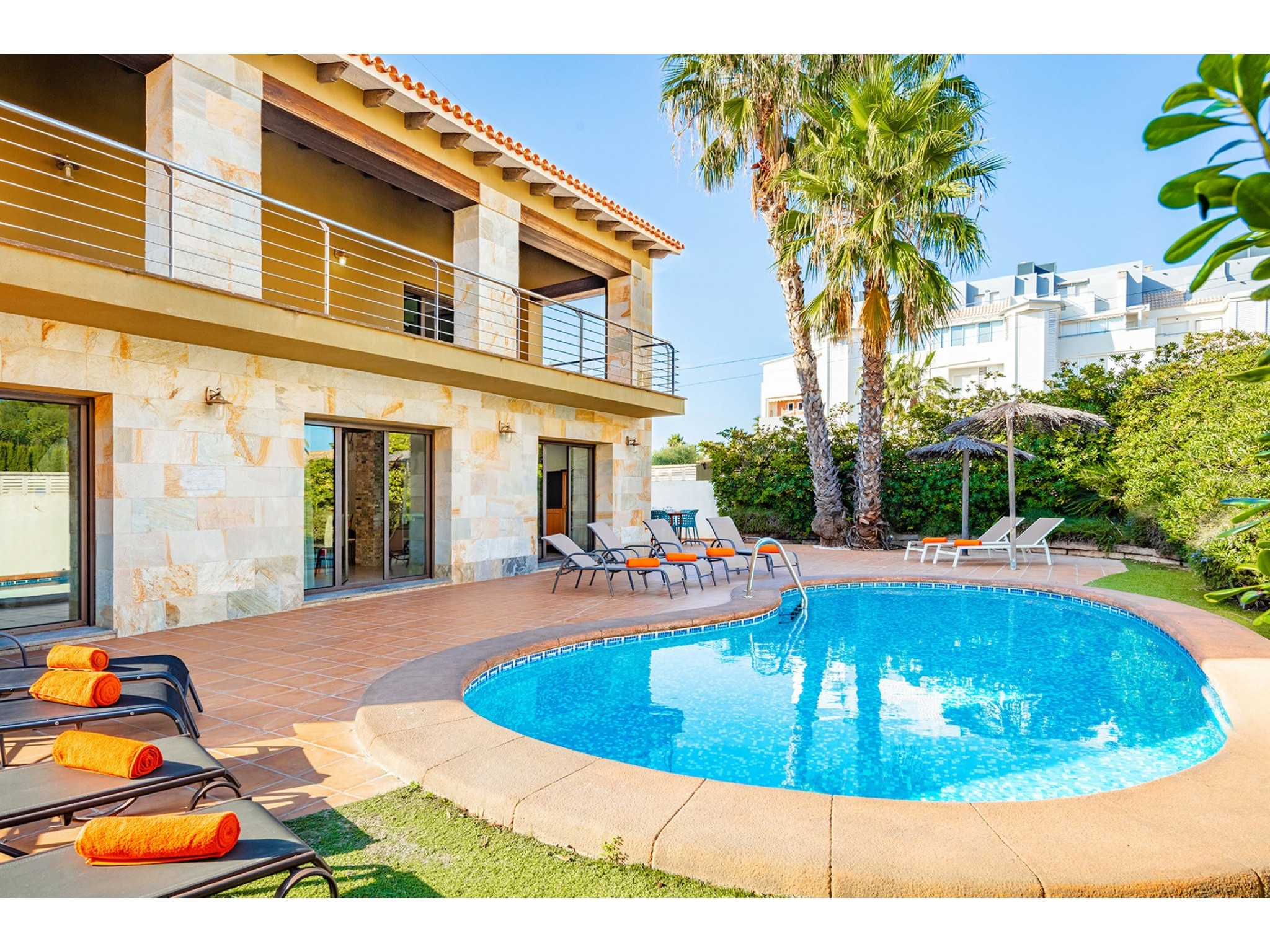 Draußen finden wir den privaten Pool, den eingebauten Grill und große Gartenterrassen, die mit Hängematten und Möbeln ausgestattet sind, um Ihr Mittag- und Abendessen im Freien zu genießen. Diese Villa ist der ideale Ort, um einen ruhigen und entspannten Familienurlaub am Meer zu verbringen. Es hat auch drei Parkplätze auf dem Grundstück und eine Klimaanlage.