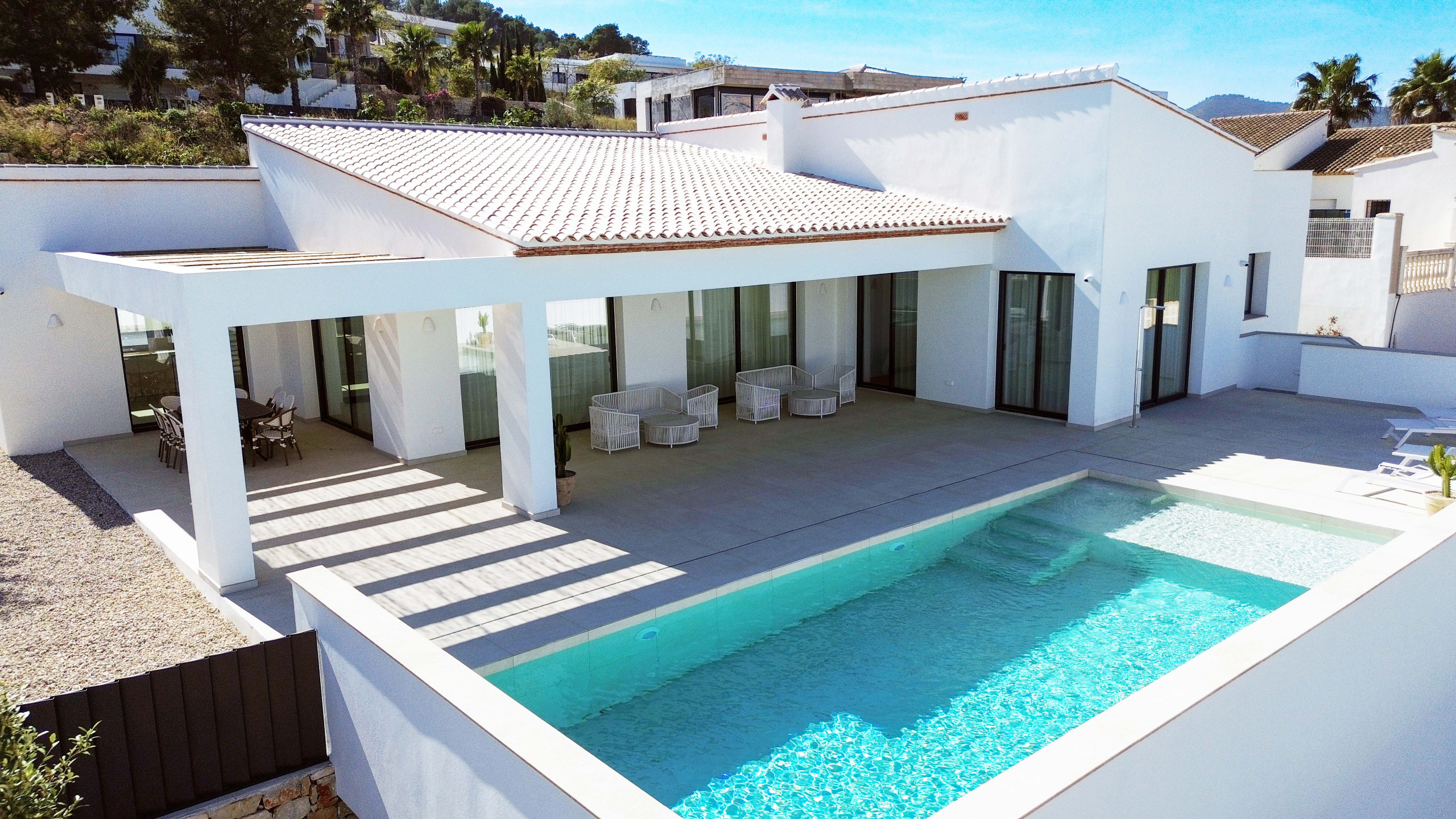 Depuis le salon-salle à manger entièrement vitré avec vue sur la piscine et la montagne du Montgo, on accède à la zone de la piscine, du barbecue et de la deuxième terrasse située à l'arrière de la maison.